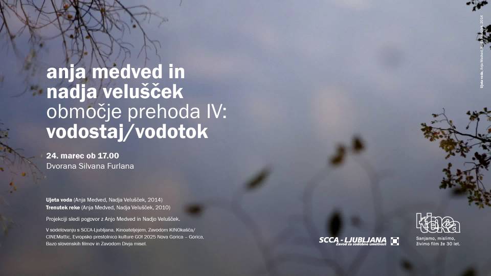 Na četrtem večeru pregleda video in filmskega opusa Anje Medved in Nadje Velušček si bomo ogledali pejsažna dokumentarca Ujeta voda (2014) in Trenutek reke (2010). Ujeta voda pripoveduje o zgodovini vodnih zajetij čezmejnega goriškega krasa, od vodnjakov do vodovoda. Trenutek reke se osredotoča na Sočo in mnoge aktivnosti, ki potekajo na njej: od načrtov za hidroelektrarne, kajakaštva, ekologije in onesnaženja, staroverstva, biodiverzitete, živali, ribolova in skrbi za ribjo populacijo, nadzora vodostaja do umetniškega navdiha.