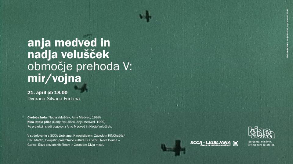 Na petem večeru pregleda video in filmskega opusa Anje Medved in Nadje Velušček se bomo vrnili na sam začetek in si ogledali njun prvi film, Cvetoča Brda (1998), ki to področje severne Primorske prikaže na realistično-magičen način, ter njun prvi srednjemetražni dokumentarec, Niso letele ptice (1999), ki se prek otroških spominov vrača v čas prve svetovne vojne.
